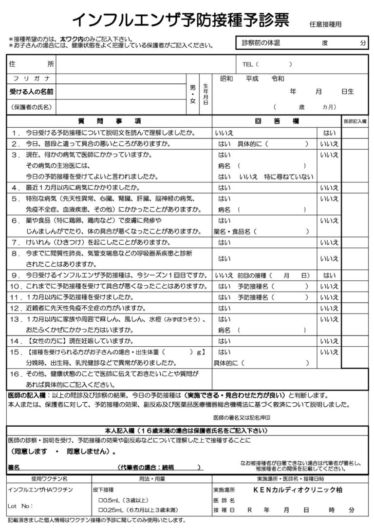 任意インフルエンザワクチン予診票