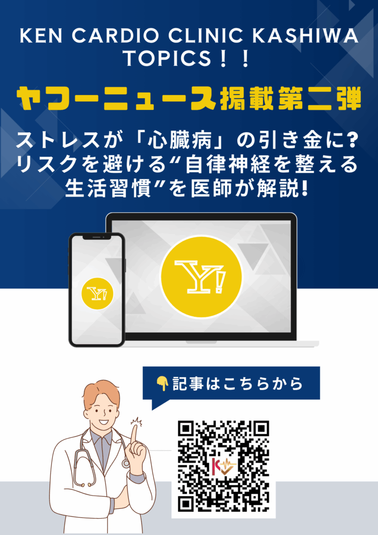 📣Yahoo!ニュースに院長インタビュー掲載 2025.11.17 現在、以下の2本の記事をご覧いただけます👇 ① 「心不全」の予防法はご存じですか? “心臓リハビリ”による運動療法の効果・実践方法を医師が解説! ② ストレスが「心臓病」の引き金に? リスクを避ける“自律神経を整える生活習慣”を医師が解説!