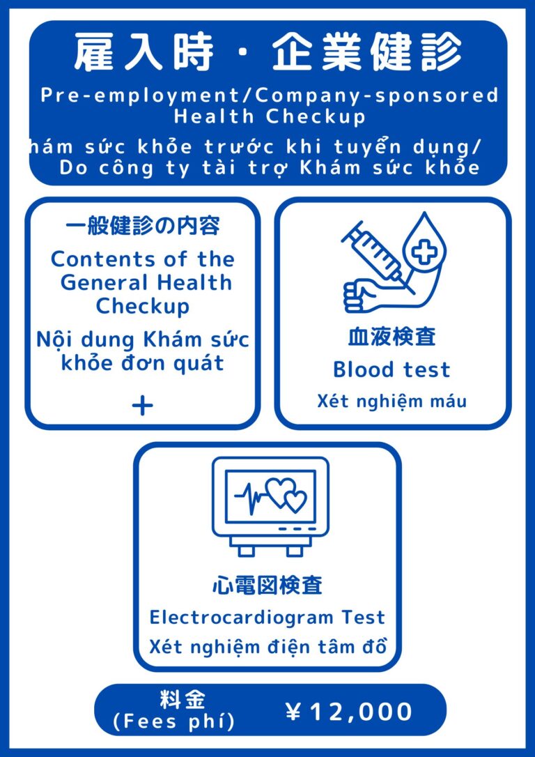 就職・転職の際に受診する必要があるものです。詳しい検査内容、指定用紙の記入方法など、ご不明点があれば何なりとお申し付けください。